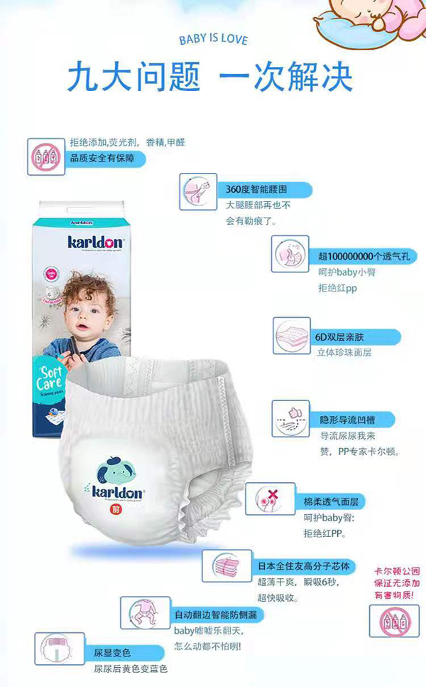 卡爾頓公園拉拉褲,專為長時(shí)間使用而設(shè)計(jì),能持久保持寶寶小屁屁干爽,透氣加倍,遠(yuǎn)離紅屁屁!快速6秒瞬吸鎖水,超薄柔軟,百分百全住友吸水因子,當(dāng)然更“靠譜”!6D復(fù)合技術(shù),隱藏式導(dǎo)流凹槽工藝,上億個(gè)微孔透氣,干雙加倍,舒適加倍!同時(shí)更采用人體工程學(xué)設(shè)計(jì),貼合小屁屁,減少腿部摩擦,穿脫建議,寶寶喜歡,媽媽省心!