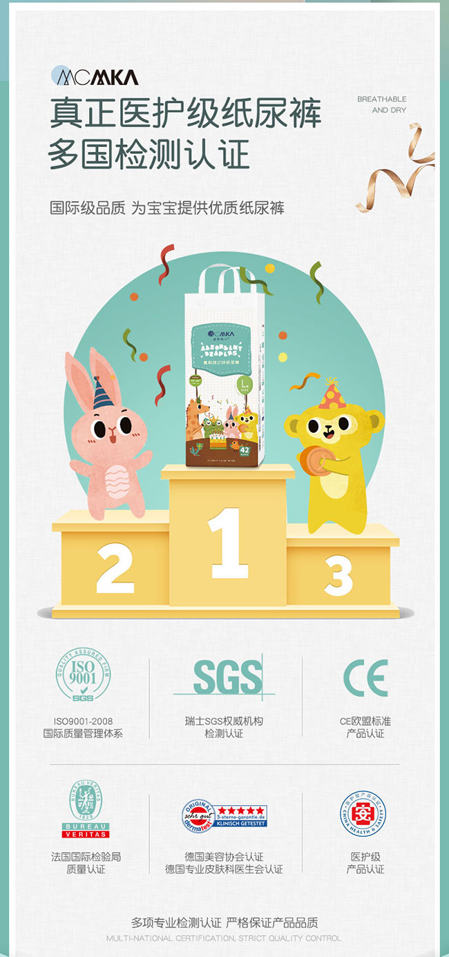 麥卡米卡慕斯超芯體紙尿褲,第4代“超芯”,更薄、更快、更干爽、更安全!獨(dú)創(chuàng)芯體U型槽,吸收更快,更大容量;超聲波壓合云朵凸點(diǎn)面層,減少皮膚接觸面,遠(yuǎn)離紅屁股;大環(huán)腰體貼腰圍,防漏不勒紅;立體雙層防漏,護(hù)圍拉伸自動(dòng)外翻設(shè)計(jì),有效防止側(cè)漏;0.1cm超薄芯,一片尿褲反鎖整夜尿量;臺灣進(jìn)口面層,立體打孔,輕松吸收,迅速把干;醫(yī)護(hù)級紙尿褲,多國檢測認(rèn)證,安全放心。