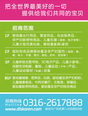 迪斯卡侖國際化五星級孕嬰童體驗式商場全國連鎖經(jīng)營,現(xiàn)以河北省廊坊市為基地向周邊輻射,全力開創(chuàng)一座孕嬰童體驗式商場,F(xiàn)迪斯卡侖12—180平米孕嬰童商鋪火爆招商,誠邀精品孕嬰童品牌入駐!機不可失,火速加盟!